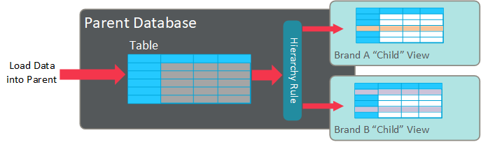 Hierarchy Rules are a top-down configuration feature set in the Parent system that determine which records from a given table a Child system can access. This feature creates a distinct database view (or subset of records) relevant for each Child system(s). To leverage this configuration option, all data is loaded through the Parent system. During the import process, Hierarchy Rules are utilized to tag a Primary Key in order to make it visible to a Child system (or potentially, to more than one Child system). The assignment of data to a Child system (or systems) can be as simple as looking at one value in one field (for example, a Brand Code identifier), or a more complex rule based on a Filter that looks at a more complex set of conditions.