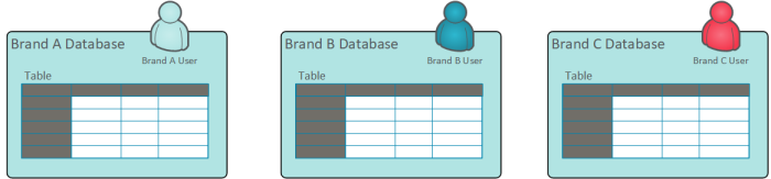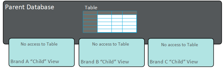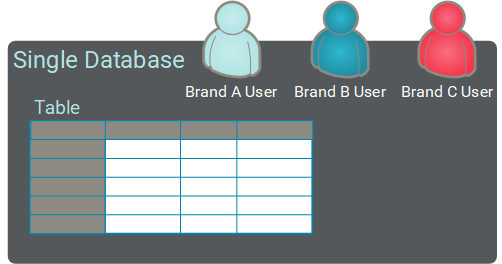 This option utilizes a single database, with all of the brand data stored within it. This configuration doesn't separate the brand data into distinct views. Every user in every brand can see the data from all other brands.