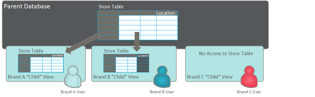 This Store table is created within the Parent system, and Brands A and B are given access to this table, but each Brand has its own unique set of stores. Therefore you could limit access to brand-specific stores, by establishing which Child systems can access which Primary Keys on the Store table. This configuration would allow each Child system to see only the Store table records that were relevant to their brand, instead of seeing all available Store table records.