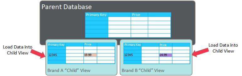 You would need to enable the Store values in this field per child system flag for the Price field on this table. This flag allows you to store Child-specific values in this field. In this example, Brand A would store 19.99 in the Price field, and Brand B would store 24.99 in this same field.