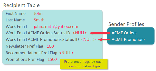 Note: Any changes made to a Sender Profile Status ID are NOT applied to any of the Preference flags in this table. In the above example, when john.smith@yahoo.com opted-out via feedback loop, the platform changed his Status ID flag accordingly. The platform doesn’t make any changes to the Preference flags in this situation.