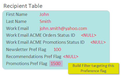 Additionally, let’s consider the case of a Recommendations Campaign. If you build the Filter with the logical rule [recommendations_pref] = ‘100,’ then john.smith@yahoo.com wouldn’t qualify, as he has a value of 'NULL' in this Preference field. However, you could expand the logical criteria in the Filter to [recommendations_pref] <> ‘1500.’ This consumer would get selected by this Filter, as this logic selects both the opt-ins (100) and the undetermined (NULL).