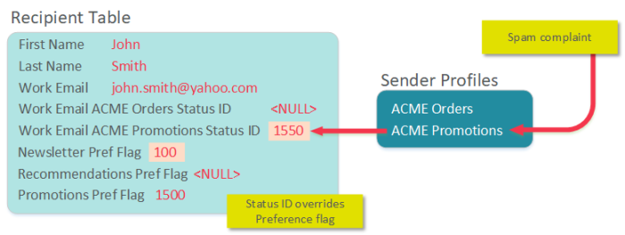 As you can see, the Sender Profile Status ID always takes precedence over the Preference flags. In particular, Feedback Loop unsubscribes like in the above example can be very damaging to a sender’s reputation, which is why the platform always checks for this status at the Sender Profile level.