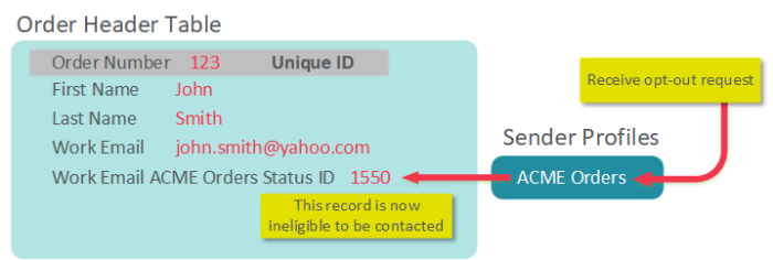 For example, let’s say you create an email Campaign using the ACME Promotions Sender Profile depicted above, and you send this message to 'john.smith@yahoo.com'. This consumer then decides he doesn’t want to receive these messages anymore, so he submits the unsubscribe form. When the platform receives this opt-out request, it will set the Work Email ACME Promotions Status ID field to ‘1500-Opt Out via Form.’ This consumer will no longer be able to receive any Campaigns that deploy using the “ACME Promotions” Sender Profile.