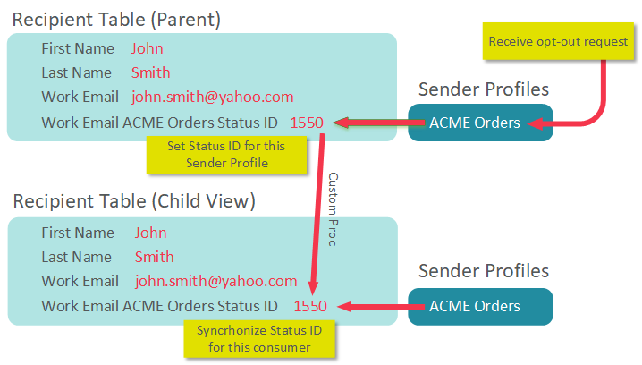In this manner, if a consumer unsubscribes from a Campaign sent from a Sender Profile in one table, the platform can set the Status ID values in all the other tables that utilize that same Sender Profile. This synchronization can be done using import / export processing, or through a custom procedure.