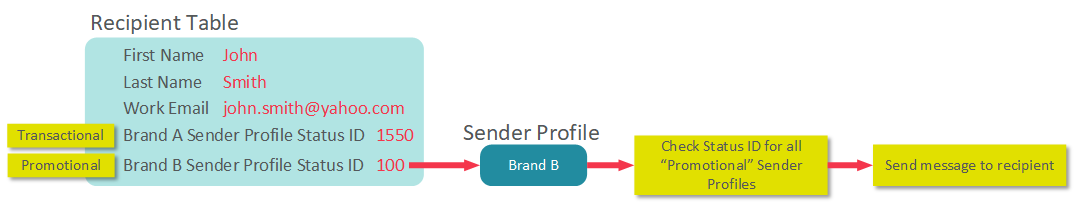 The client builds a Campaign using a Cheetah Digital by Zeta table as the data source. The client has two Sender Profiles defined on their Recipient table: Brand A Sender Profile and Brand B Sender Profile. Both Sender Profiles have been classified as Promotional. The client builds a Campaign using Brand B, and the recipient John Smith is selected as part of the Campaign audience. This recipient's Status ID of 100 for Brand B makes him eligible to receive the Campaign. However, he has opted out of Brand A. The Cheetah Digital by Zeta platform checks the Status ID value for all Promotional Sender Profiles on this table. Seeing that John Smith has a Status ID of 1550 for Brand A, the platform would suppress this recipient from the Campaign.