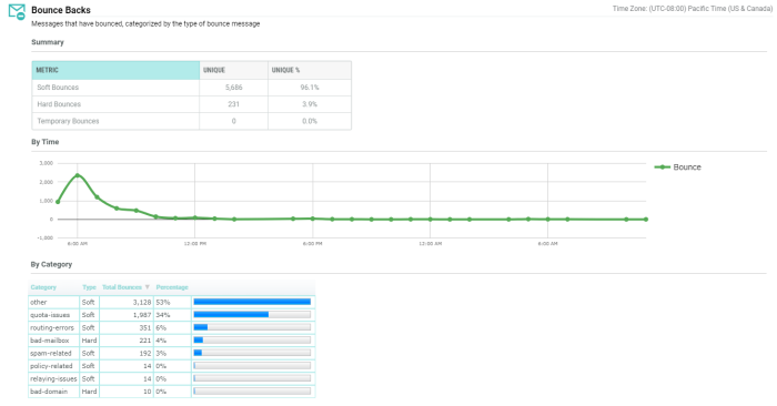 As part of Cheetah Digital by Zeta's standard Campaign Reports, the Bounce Backs sub-report provides details on the quantity, timing, and type of bounce conditions that occurred as a result of a Campaign.