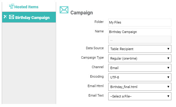 After browsing to and selecting the appropriate .zip file, you would next create your Campaign. You would then select Birthday_final.html as the file for the Email HTML format, and Birthday_final.txt as the file for the Email Text format.