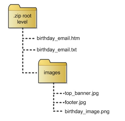 In this example, let's say you want to upload a new email Campaign, along with some images used within the Campaign content. You've created HTML and Text versions of the Campaign. The root level of your .zip file would contain the two format version files (one HTML file and one Text file), and a folder containing all of the necessary images.