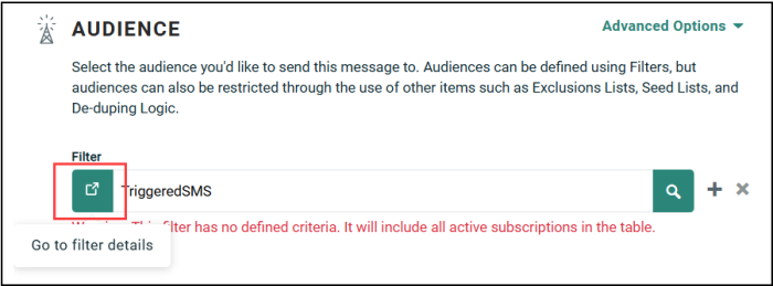 Note: If you assign an empty filter (that is, a filter that doesn't have any logic criteria within it) to a Campaign, the Campaign will deploy to all recipients in the Campaign's source table. In most cases, this isn't desired. The system will display a warning messages if the Filter is empty, but you should also always check that you've assigned the correct filter to the Campaign and check the Filter logic to make sure it's selecting the desired recipients.