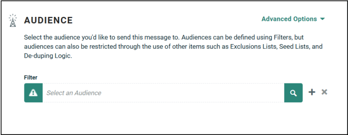The Audience sub-section is used identify to whom you're sending your Campaign message. The platform offers several different options to both select and restrict your Campaign Audience.