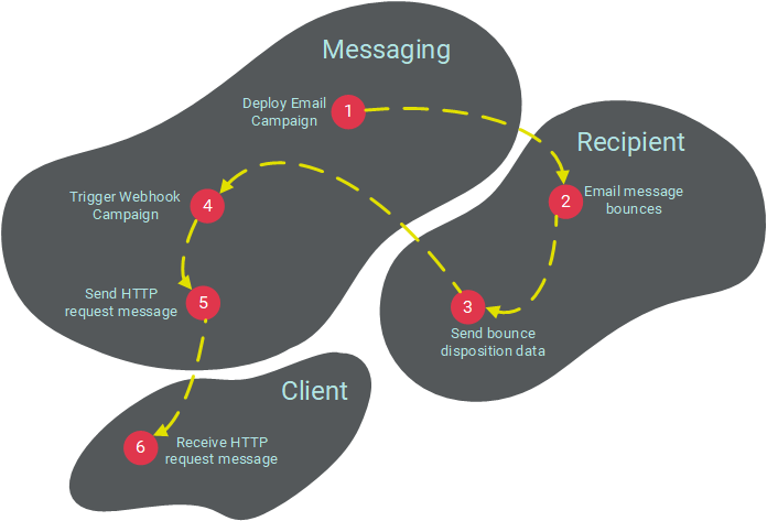 As an example, let's say you send out order confirmation email messages to your consumers. In the event that one of these messages bounces, you want to be notified so you can follow up with the consumer through another channel, such as over the phone or by SMS text. You could set up a Webhook Campaign that uses "Email Bounce" as its trigger type. When the system identifies a bounced email, it would trigger the deployment of the Webhook Campaign to send an HTTP request message to your internal customer service system. This message could be configured to include the consumer's name, order information, and phone number.