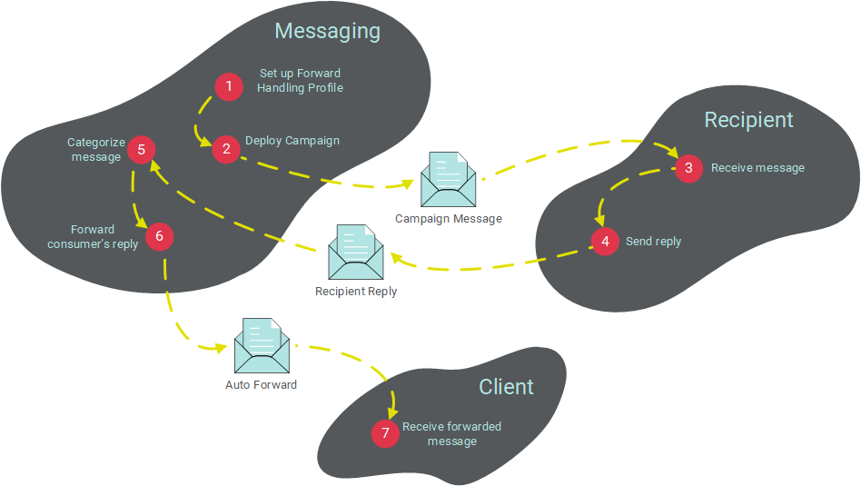 In some cases, recipients of an email message from an email marketing campaign may attempt to respond to that message. The platform can be configured to automatically forward the consumer's reply (in plain text format, without any images or attachments), along with a standard message and subject, to a specified person or group. For example, you could forward all consumer replies to a sales team, or a customer service representative, for follow-up.