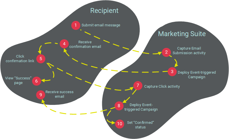 With this method, you create a "Handler" that controls the double opt-in process. The Email Submission Handler consists of a special email address that consumers can contact to submit their registration. Upon receipt of a message sent to this email address, the platform triggers the deployment of a Event-based Campaign. The contents of this Campaign include a registration confirmation link (which can optionally have an expiration assigned to it). When the consumer clicks the link, the Email Submission Handler updates the "Confirmation" status field.