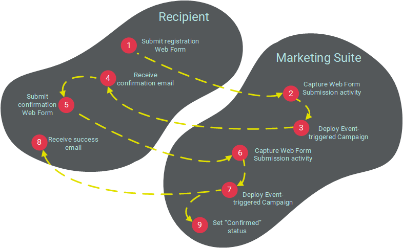 With this method, you create a Web Form for the consumer to enter and submit his or her registration. The submission of this form triggers the deployment of a Event-based Campaign. The content of this Campaign contains a registration confirmation link (which can optionally have an expiration assigned to it). When the consumer clicks the link, a second Web Form is displayed for the consumer to confirm his or her opt-in. When the consumer submits this second Web Form, the system sends a "success" email message, and updates the "Confirmation" status field. For more information on setting up Web Forms, please see the Web Forms topic.