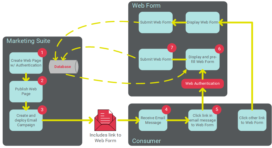 The following diagram depicts this process of using a Web Form in conjunction with an Email Campaign. The email message contains a link to the Web Form. When the customer clicks this link, the URL passes the necessary identifying information, validates the consumer's identity, and pre-fills the Form. Consumers who access the Web Form through some other means, such as a link from your corporate website, will not use the Web Authentication, so the Form will not be pre-filled.