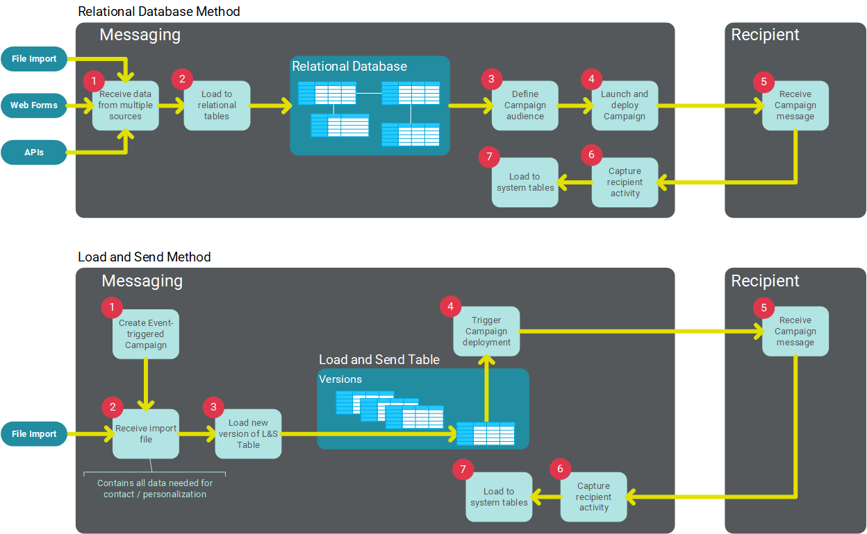 However, within that basic process, the Load and Send feature has a few key differences. The following diagram compares the typical process flow for a Campaign based off a full relational database, and a Campaign based on the Load and Send method.