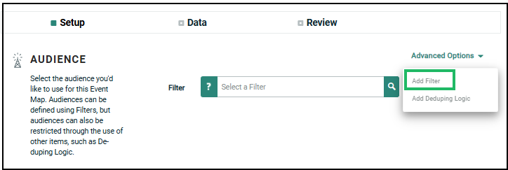 In the Audience section within the Setup tab, select Advanced Options > Add Filter. You can either select an existing filter or add a new filter.