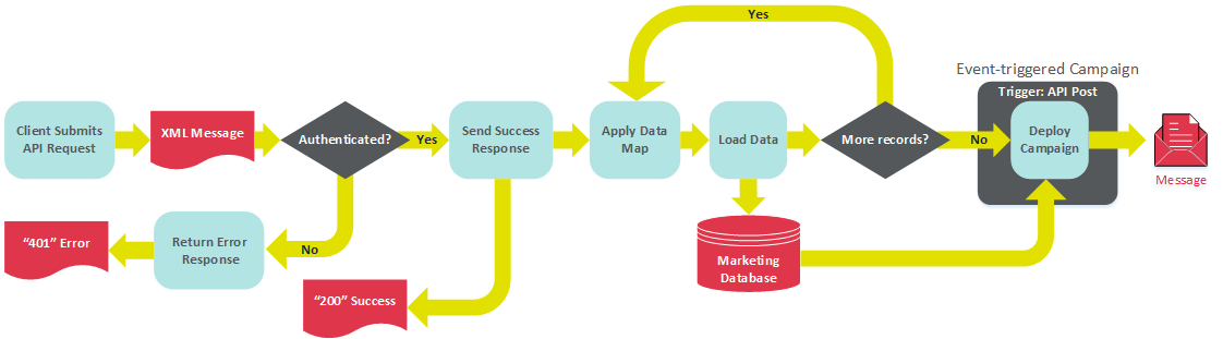 Campaign -- You must define and launch an Event-triggered Campaign that uses the above API Post as the event trigger. If you're loading data into multiple tables, you typically want to use the final API Post in the sequence, to ensure that all data is loaded into the database before building and deploying the message.