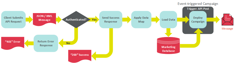 When defining an Event-triggered Campaign, the platform allows you to use that API Post as the triggering mechanism. Upon receipt of a message that references this API Post, the system will deploy the Campaign. The platform will load or update the database prior to deploying the Campaign, which allows you to use data from your database when building your message content.