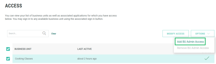Select Options > Add BU Admin Access.