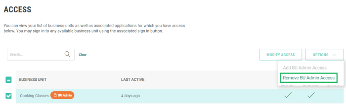 Select Options > Remove BU Admin Access.