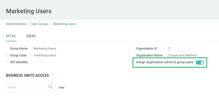 Optionally, to automatically make all users in the User Group an Organization Administrator, toggle Assign Organization Admin to Group Users to On.