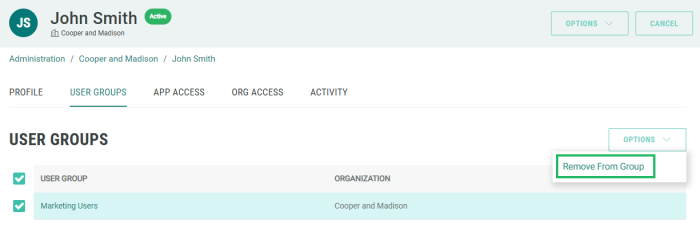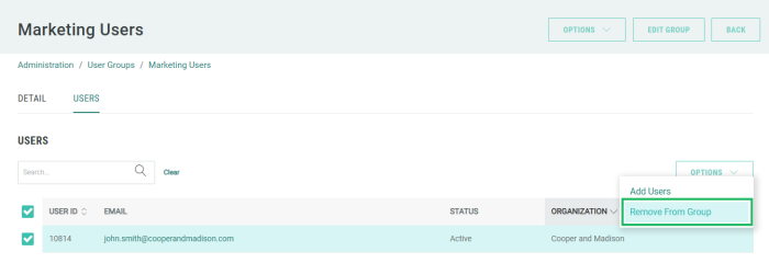 Select Options > Remove from Group. A success message is displayed; click OK.