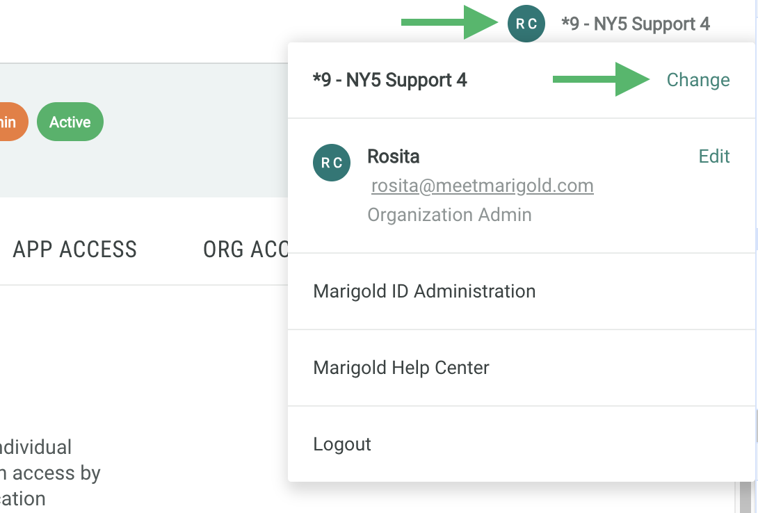 • From the drop down, click Change next to the name of the business unit you are currently using