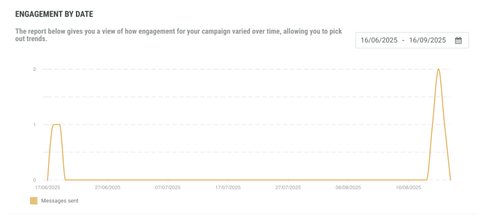 Engagement by date widget provides a view of how engagement, such as clicks, replies, opt-outs, and messages sent, varied over time for your campaign, helping you identify trends.