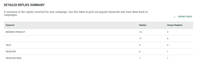 Detailed replies summary shows the popular keywords used in replies so that you can trace them back to your campaigns.