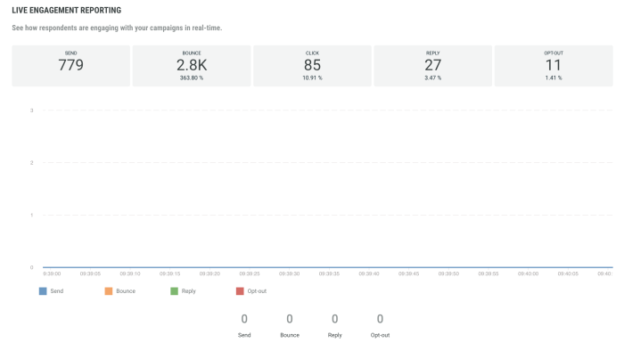 This report provides live engagement reporting (SMS sent, bounced, clicked, replied and opted-out) and show how respondents are engaging with your campaign in real time. The graph shows live information within a time frame of less than a minute.