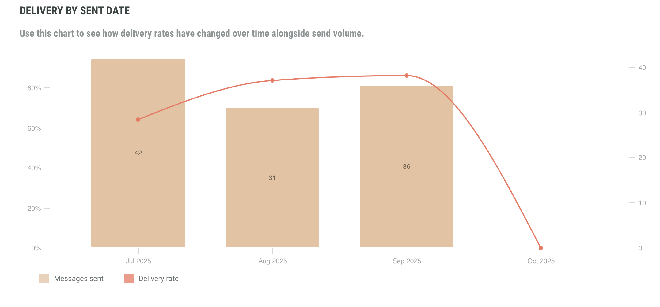 The Delivery by Sent Date report shows how delivery rates have changed over time alongside the send volume.