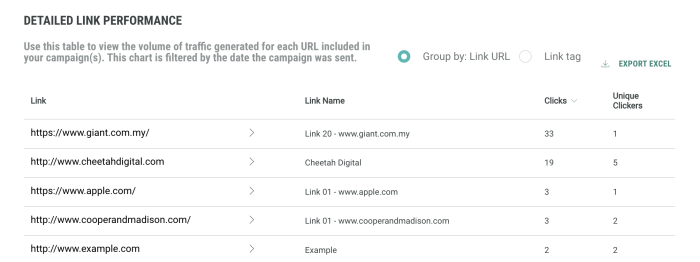 If you are interested in click behavior for individual links, the table view Detailed Link Performance is provided, showing per individual link the number of clicks versus unique clicks.