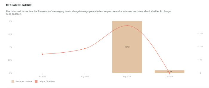 The Messaging Fatigue graph shows the frequency of messaging trends alongside engagement rates, so you can make informed decisions about whether to change send cadence.