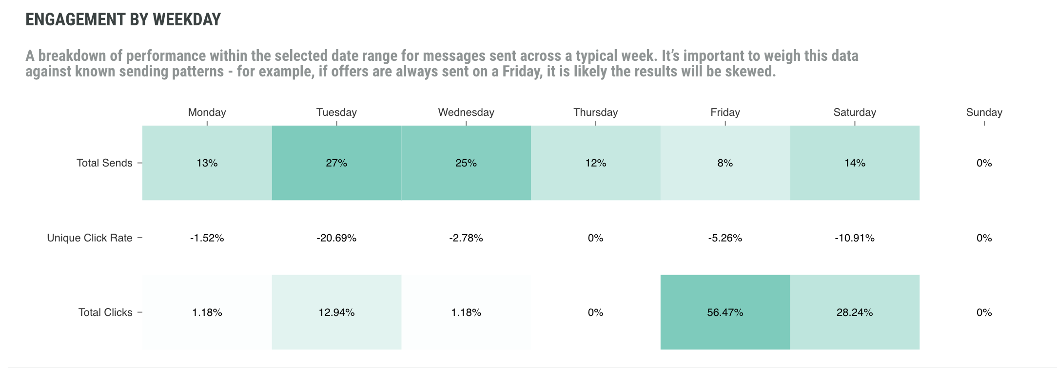The Engagement by Weekday report shows breakdown of performance within the selected date range for messages sent across a typical week. This heatmap shows data for each day of the week and contains the following metrics: