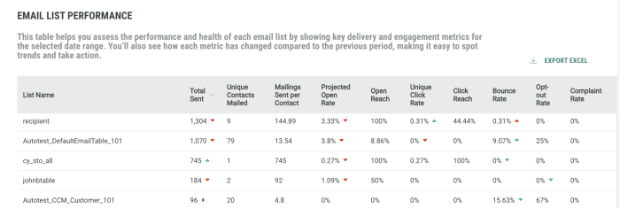 The List Performance table helps you assess the performance and health of each list by showing key delivery and engagement metrics for the selected date range. You’ll also see how each metric has changed compared to the previous period, making it easy to spot trends and take action.