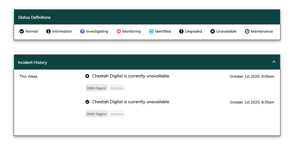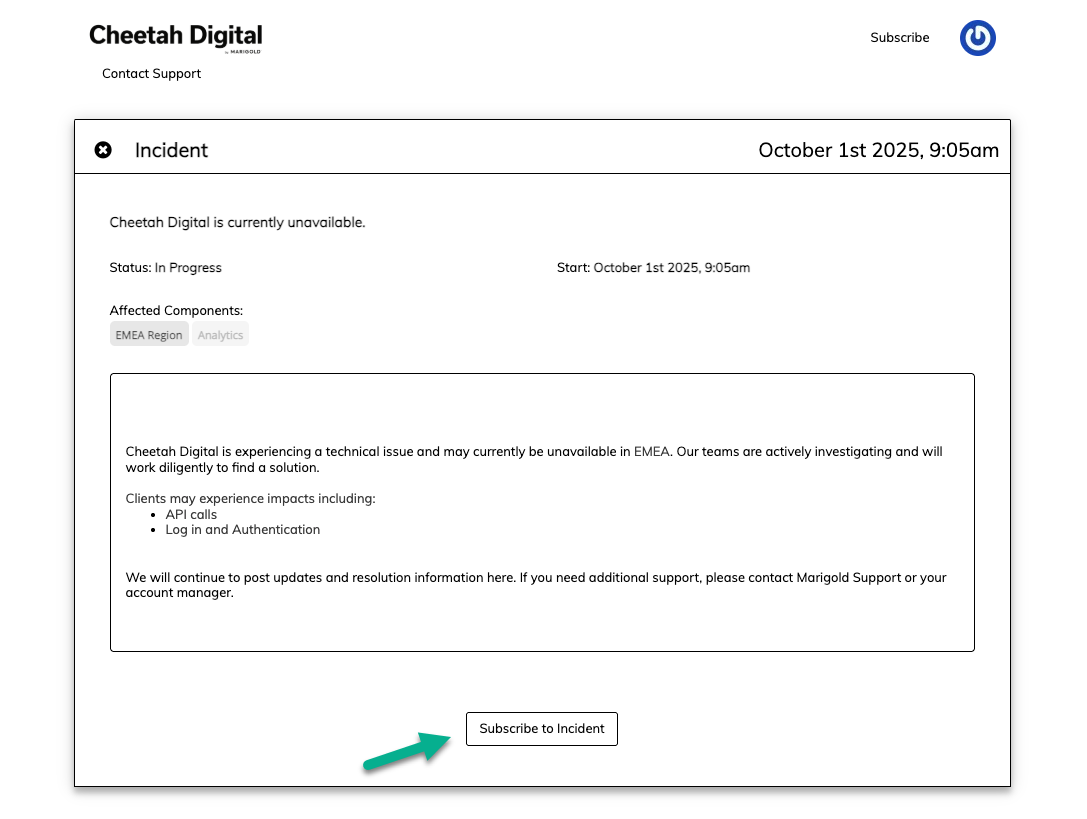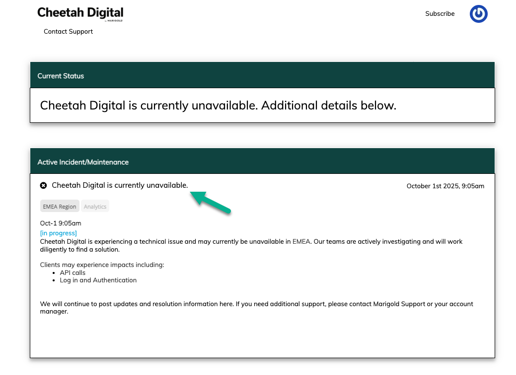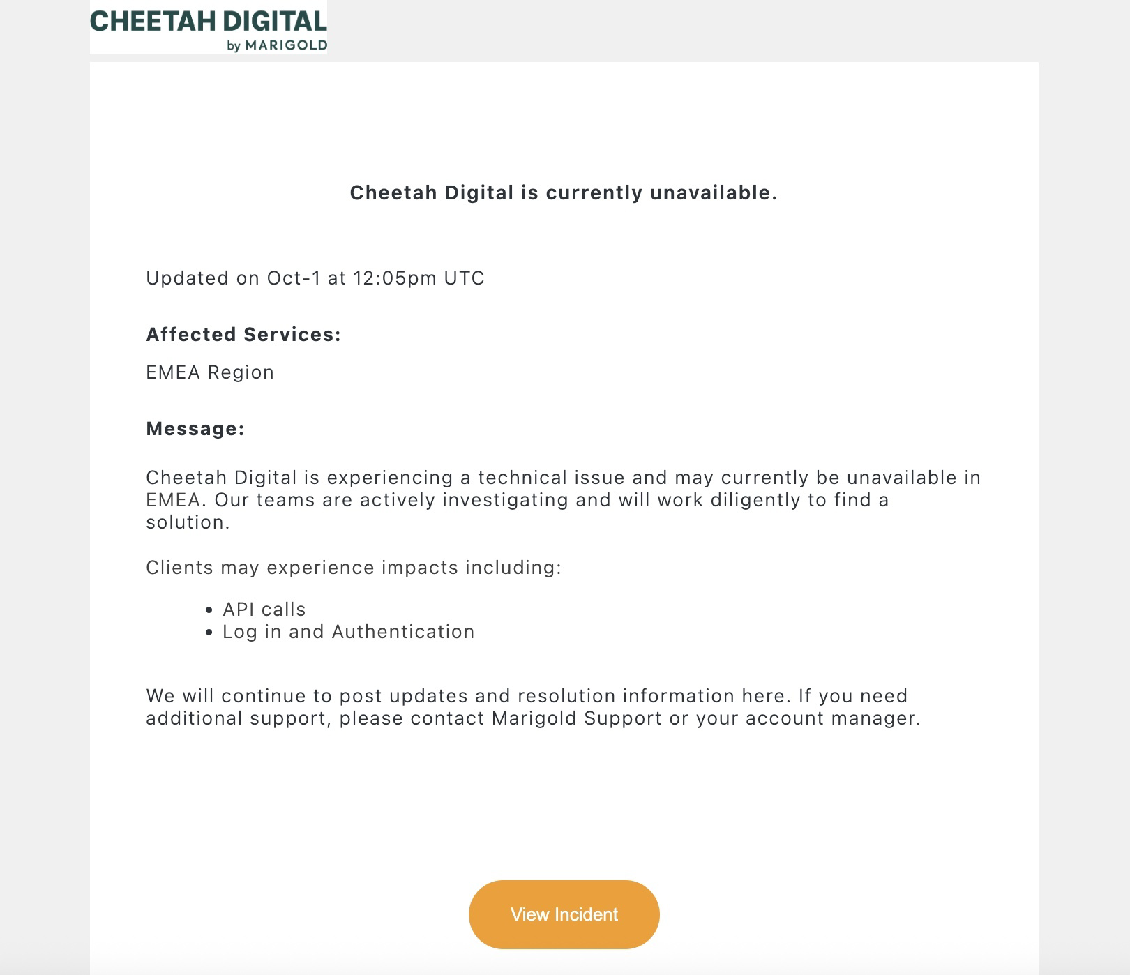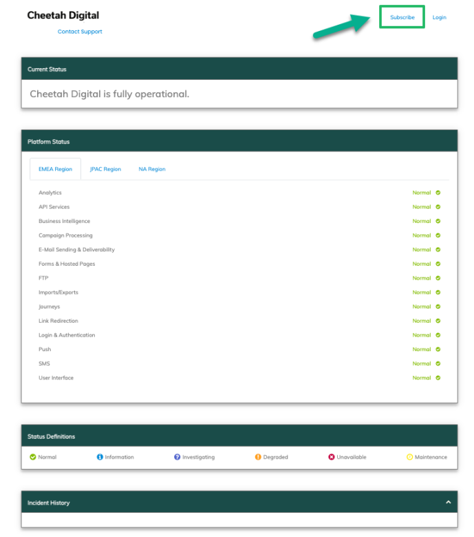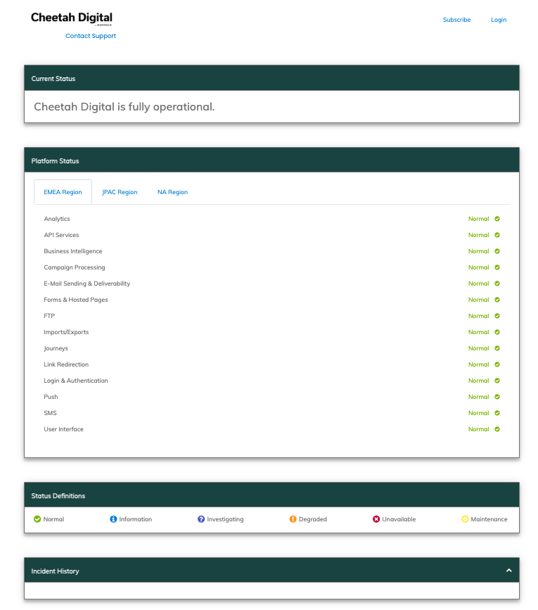 The status page provides you with regular updates regarding the status of the Cheetah Digital by Zeta platform in the event of a major system incident in your region. In this article we’ll explain the information you will see and how to subscribe to the Cheetah Digital by Zeta notification system to receive regular updates on the platform status, which we highly recommend to all users.