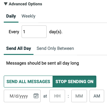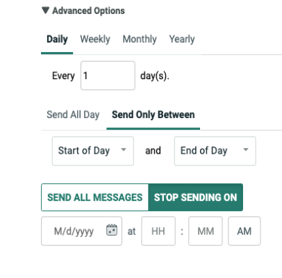By default, the platform will send messages every day, all day long, until all the messages have been sent. You can define a daily Sending Window, and the platform will send messages only during this Sending Window. You can also define daily or weekly sending frequencies.