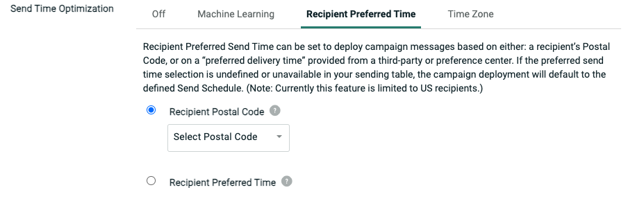 The Postal Code option uses a Postal Code field to optimize Campaign deployment based on each recipient's local time. To use this feature, the Campaign's source table must have a dedicated Postal Code field.