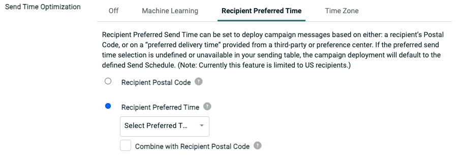 The Recipient Preferred Time option lets you optimize Campaign deployment based on data imported into the platform from a third-party source. The Preferred Time must be stored in a Date / Time field. The platform will consider only the hour component of the Date / Time value; the date, minute, and second components are ignored.
