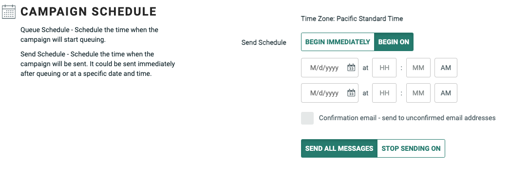 The Queue Schedule controls the message building phase. By default, the Queue Schedule is set to Begin Immediately, meaning as soon as the Campaign is launched.