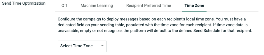 The Time Zone option uses a time zone field to optimize Campaign deployment based on each recipient's local time. To use this feature, the Campaign's source table must have a dedicated time zone field.