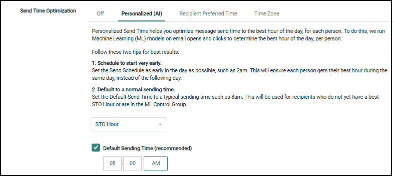 Note: The drop-down and Default Sending Time may be pre-selected for you by default, but it is the Personalized (AI) tab selection that enables / disables Personalized Send Time.