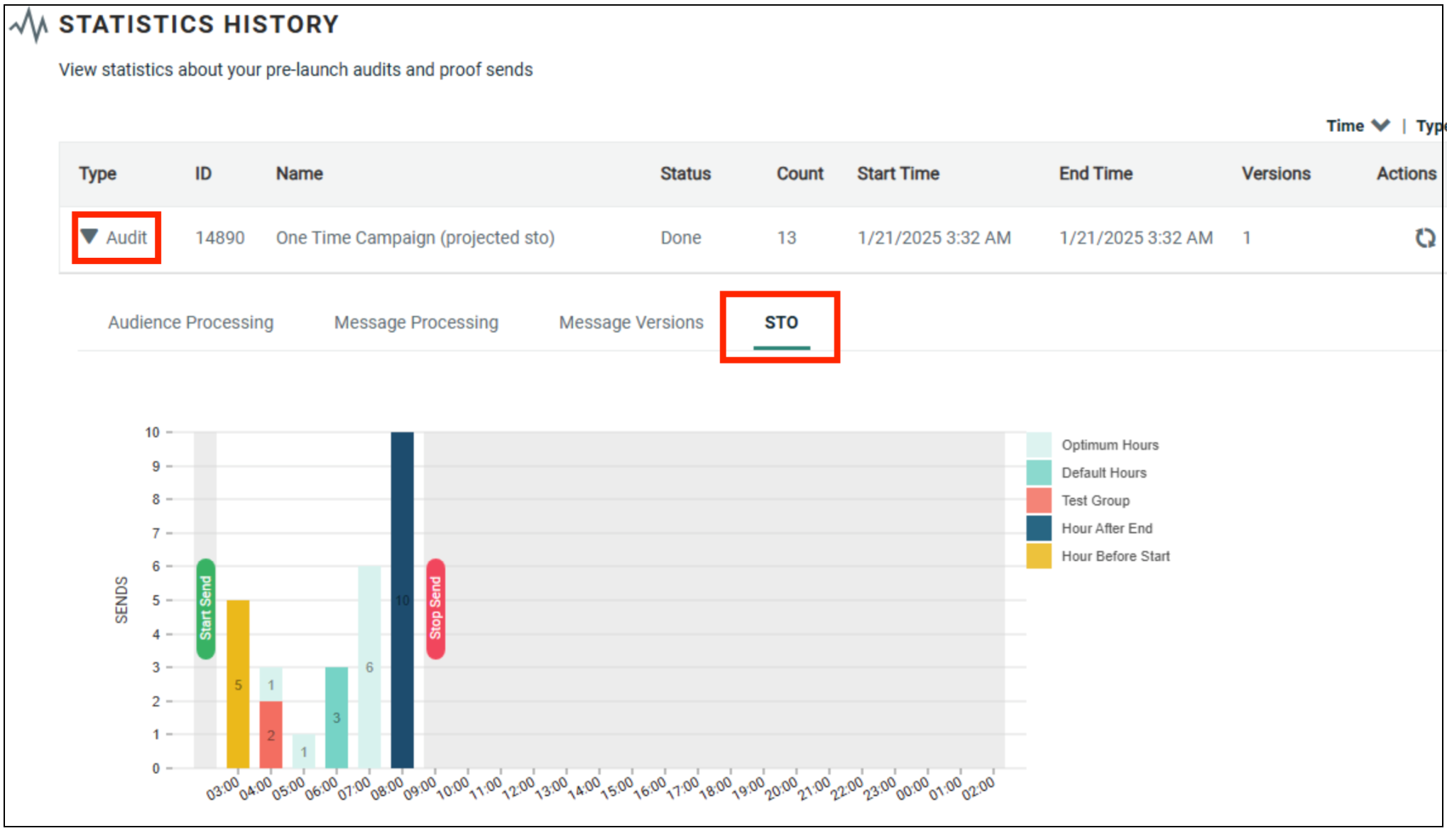 The Campaign Audit result provides the ability to view the STO projection send per hour before launching a campaign, in the STO tab of the Statistics History section.