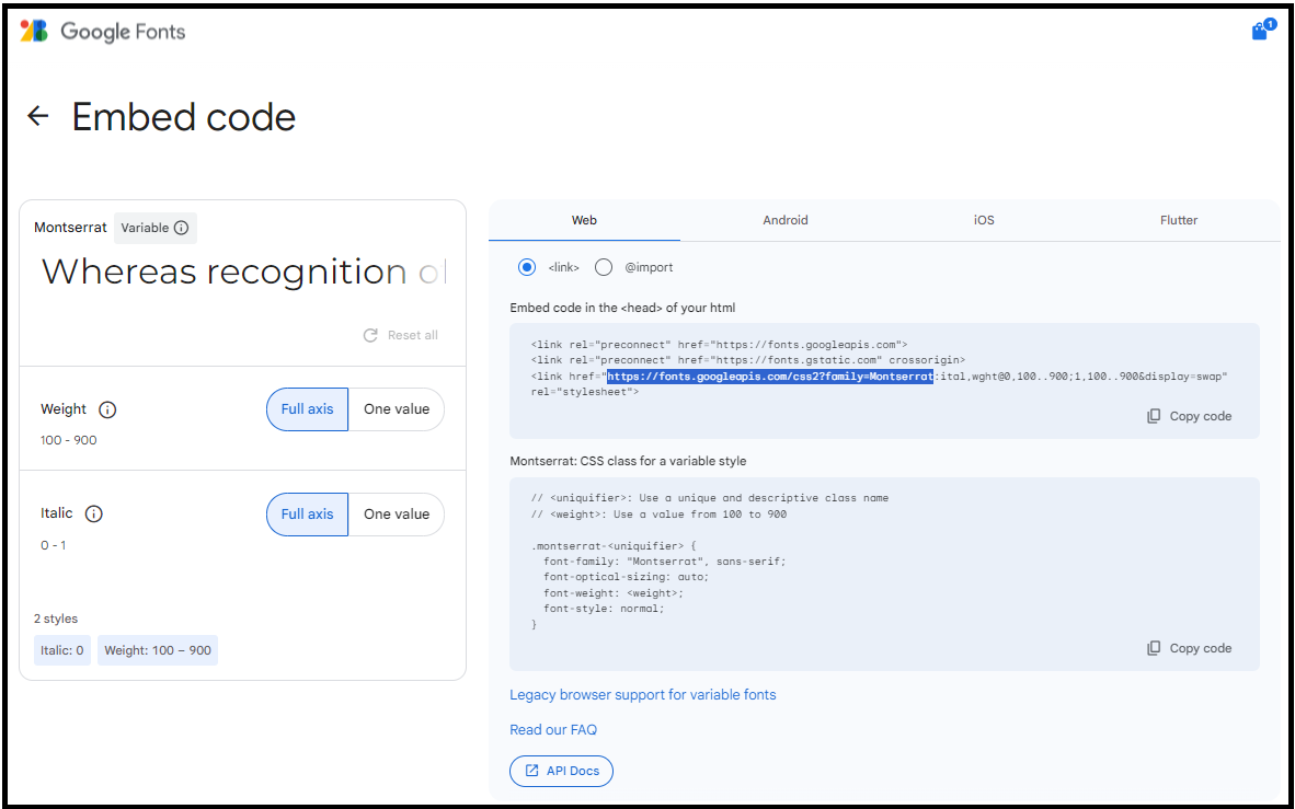 The address of the CSS document used to embed the font files and the CSS rules that apply them. For example, this is a Montserrat stylesheet generated by Google Fonts: https://fonts.googleapis.com/css2?family=Montserrat
