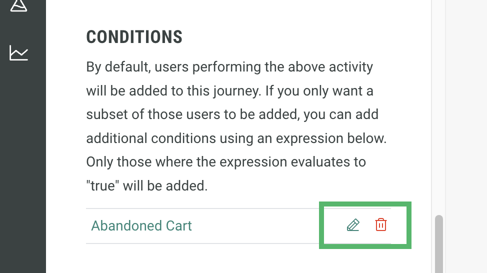 If the conditions are invalid, the name of the expression will turn red in the edit pane, and a red exclamation mark (!) will appear next to it. You will need to correct the invalid expressions before publishing your Journey.