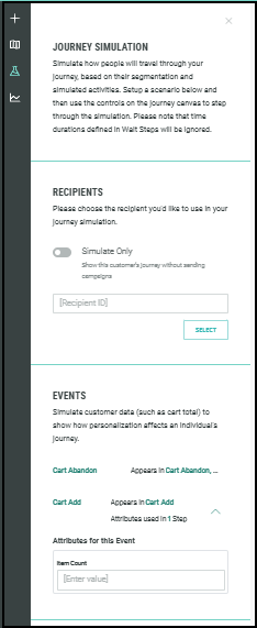 The Journey simulation tool guides you through the Journey process showing how an user will travel through your Journey, based on their segmentation and simulated activities. To set up a scenario, define the relevant event attributes. Please note that time durations defined in Wait Steps will be ignored during the simulation.