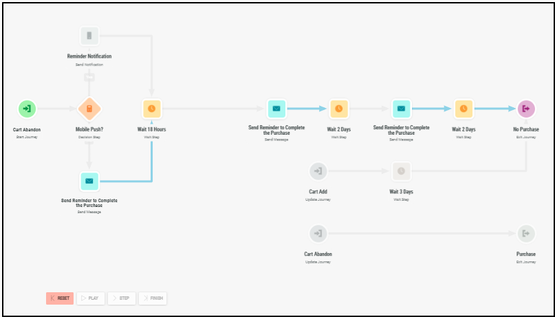 Click Play to see the user travel through the Journey, based on the attributes and personalized data. Alternatively you can use Step, or Finish.