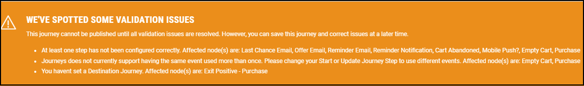 During the Journey creation process, users are presented with several indicators of mandatory, pending configurations — such as when building multi-step campaigns or applying and saving changes on the Journey canvas. This pops up as a large orange banner that lists all the required updates.